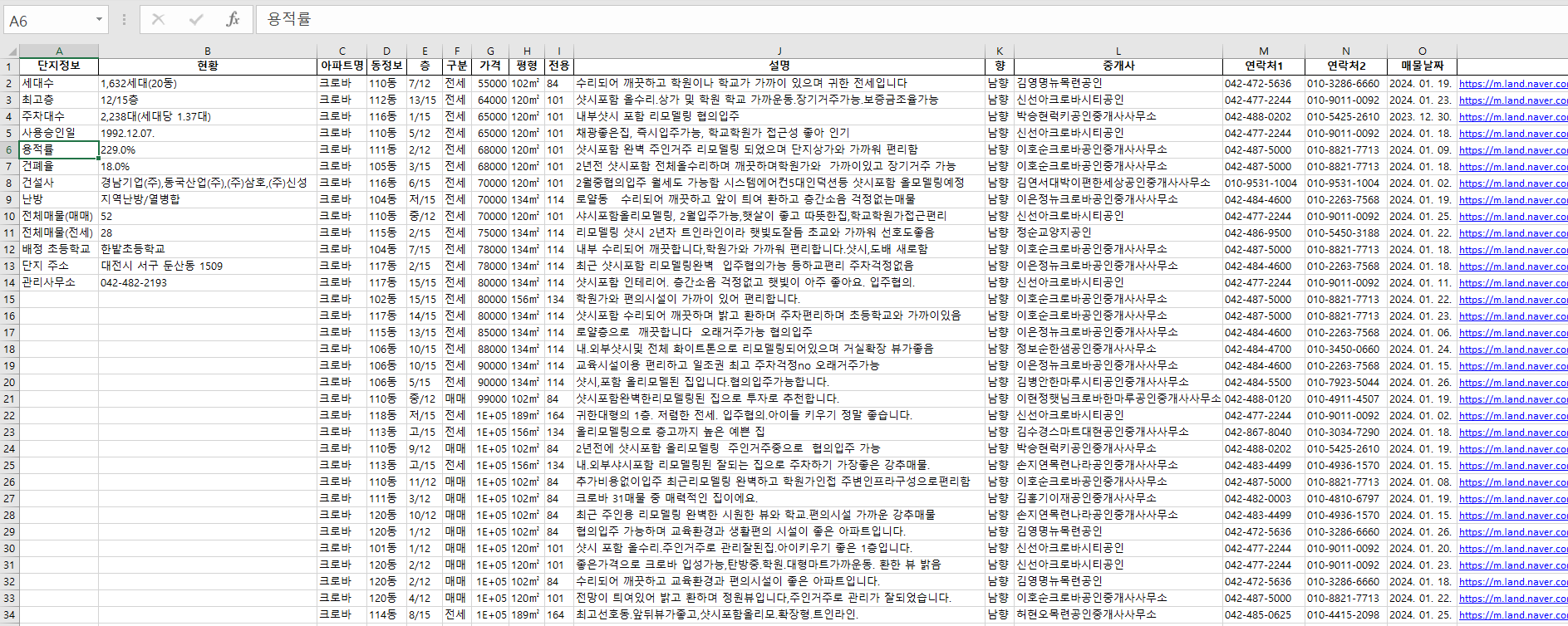 - 프로그램은 해당 아파트 단지의 세대수, 최고층, 주차대수, 사용승인일, 용적률, 건폐율, 건설사, 난방방식, 매물수, 배정 초등학교, 단지 주소, 관리사무소 연락처 등 다양한 정보를 엑셀에 자동으로 저장합니다.
